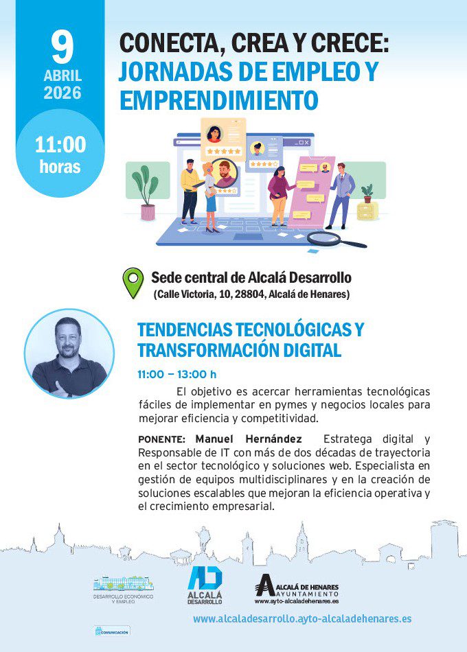 El próximo jueves 9 de abril, a las 11:00 horas, Alcalá de Henares acogerá una jornada práctica sobre transformación digital dirigida a autónomos, comerciantes y responsables de pymes. El encuentro tendrá lugar en la sede de Alcalá Desarrollo, en la calle Victoria, 10, y será impartido por Manuel Hernández, experto con más de 20 años de experiencia en tecnología y gestión de proyectos digitales.