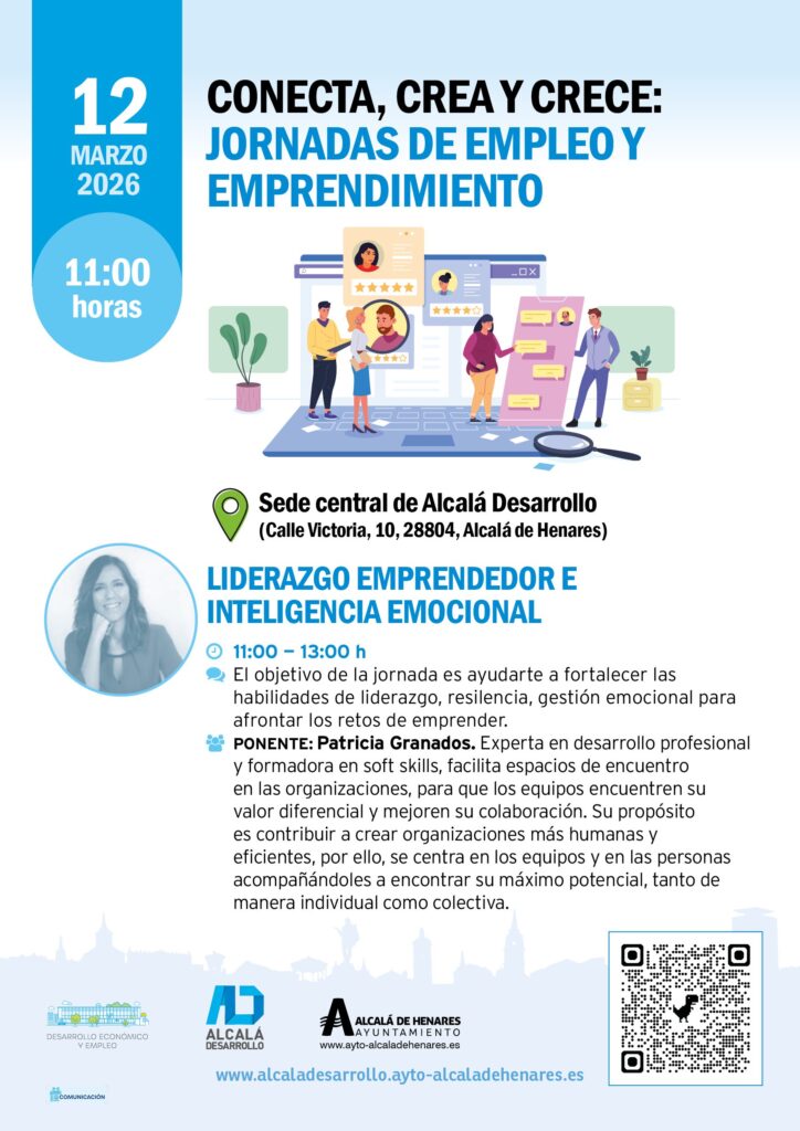 Alcalá de Henares, 10 de marzo de 2026.- Este jueves 12 de marzo, el Ente Público Alcalá Desarrollo organiza una nueva sesión dentro de su programa formativo «Conecta, Crea y Crece». La charla, titulada «Liderazgo emprendedor e inteligencia emocional», se centrará en la importancia de gestionar las emociones para alcanzar el éxito profesional en el entorno laboral actual.
