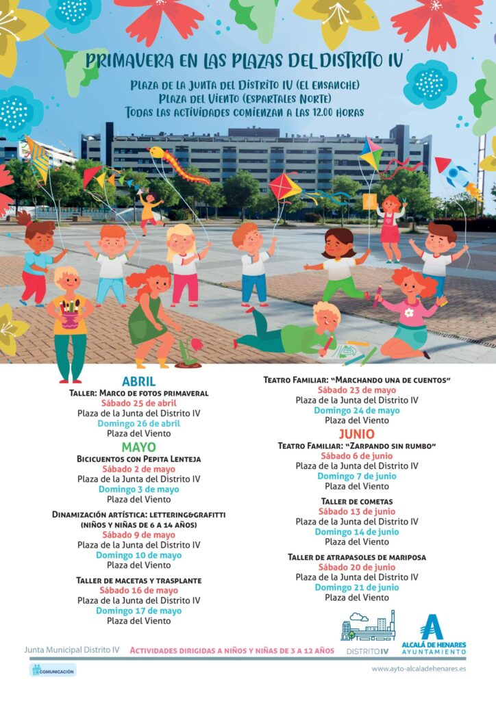 El Distrito IV celebra la llegada de la primavera con un completo programa de actividades al aire libre para niños y niñas de 3 a 12 años. Desde el 25 de abril hasta el 21 de junio, las plazas de la Junta Municipal y del Viento, en los barrios de Espartales Norte y el Ensanche, se llenarán de talleres, teatro y animación artística pensados para las familias del distrito.