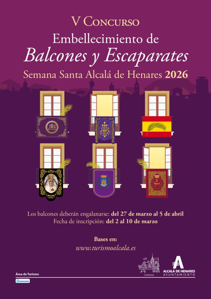 La inscripción para participar en el V Concurso de Embellecimiento de Balcones y Escaparates durante la Semana Santa de Alcalá de Henares estará abierta del 2 al 10 de marzo de 2026. Esta iniciativa, promovida por el Ayuntamiento de Alcalá a través de la Concejalía de Turismo y la Junta de Cofradías, busca realzar el atractivo de las calles de la ciudad durante una de sus fiestas más emblemáticas, declarada de Interés Turístico Nacional.