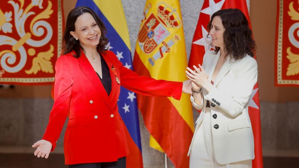 La presidenta de la Comunidad de Madrid, Isabel Díaz Ayuso, entregó hoy la Medalla de Oro de la región a María Corina Machado, líder de la oposición venezolana y Premio Nobel de la Paz. También otorgó la Medalla Internacional al presidente electo venezolano Edmundo González, representado en la ceremonia por su hija Carolina, debido a problemas de salud de González.